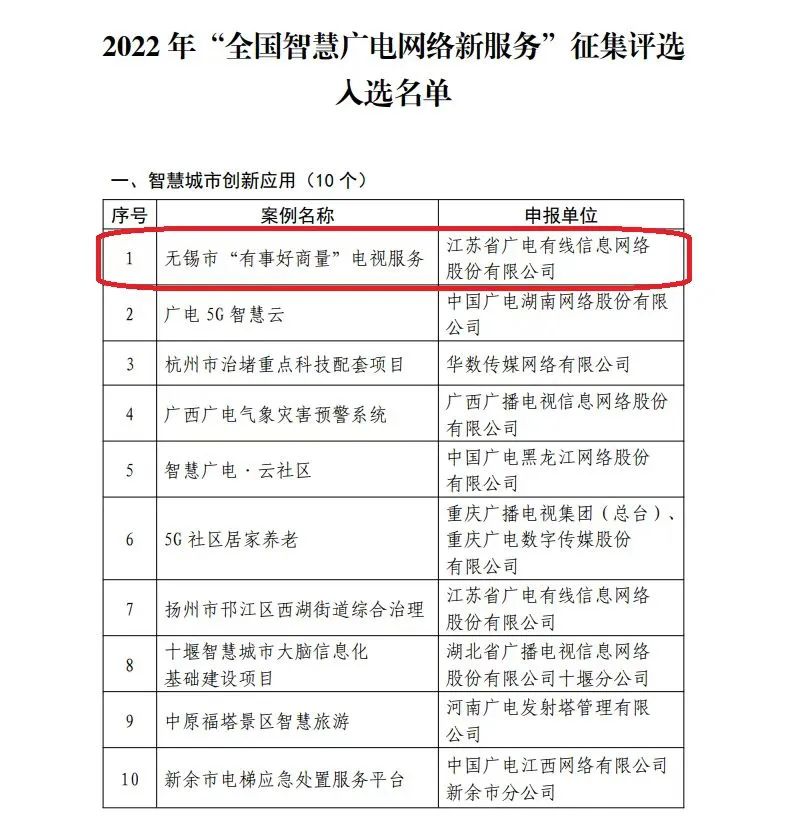 經(jīng)過(guò)復(fù)評(píng)和終評(píng),由江蘇有線無(wú)錫分公司建設(shè)的無(wú)錫市“有事好商量”電視服務(wù)項(xiàng)目入選2022年“全國(guó)智慧廣電網(wǎng)絡(luò)新服務(wù)”之智慧城市創(chuàng)新應(yīng)用10佳案列,并位列首位。